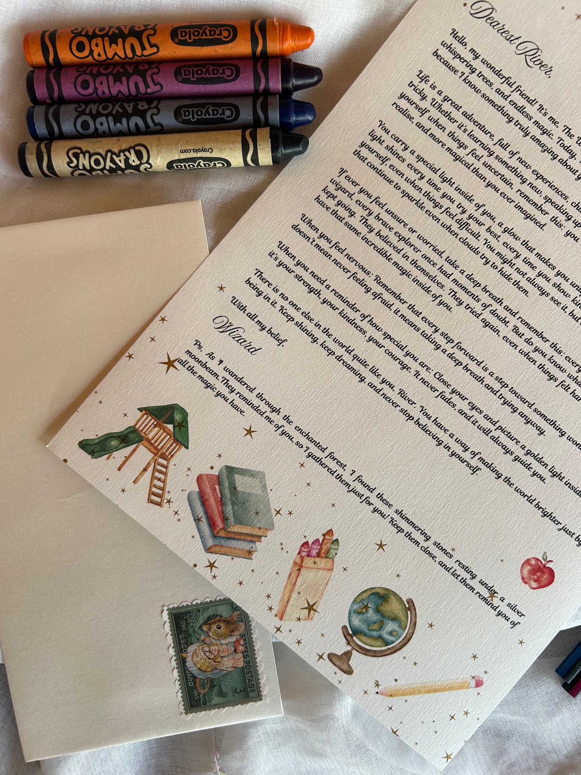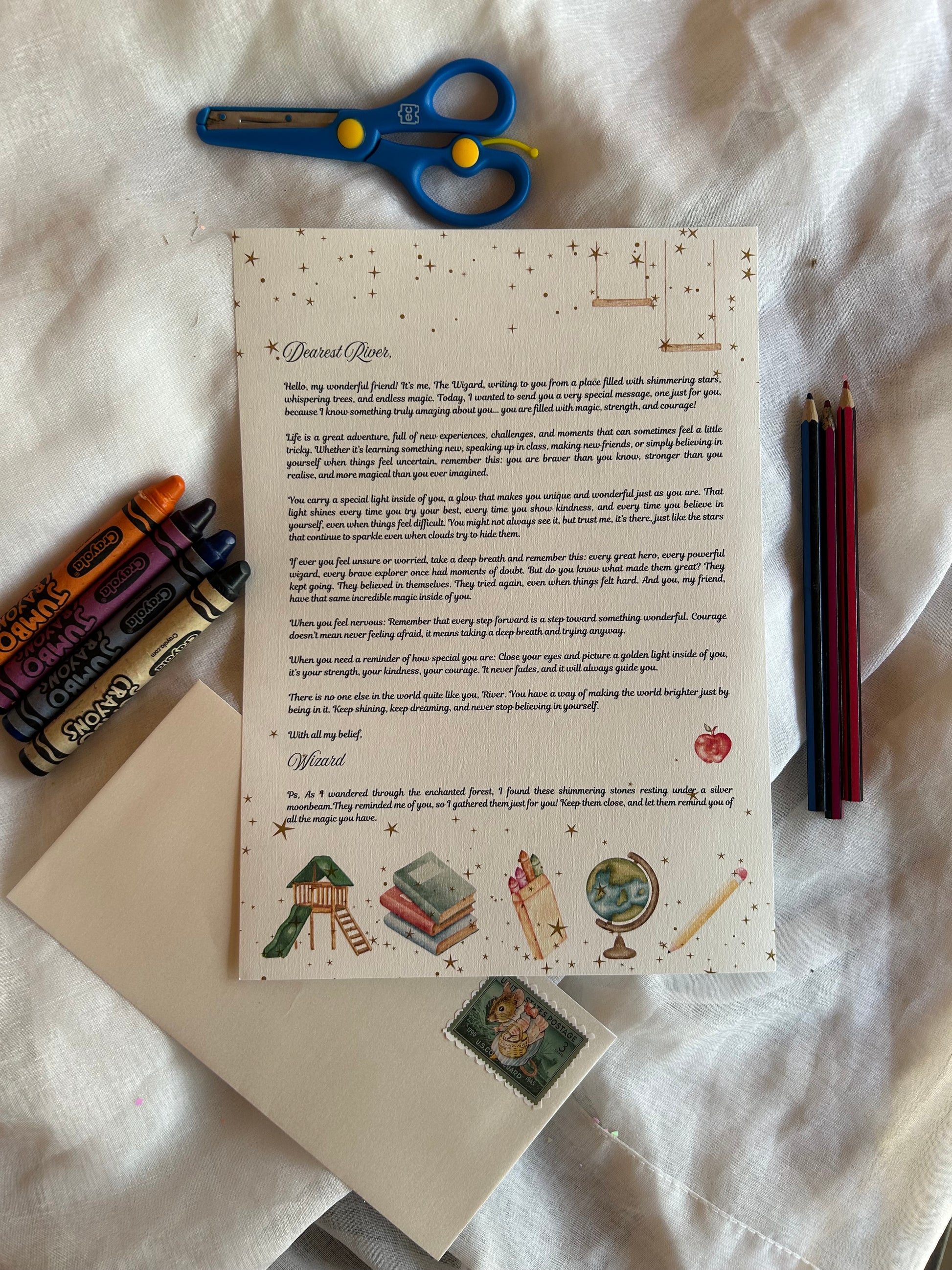 Inspire your child with a letter full of encouragement, magic, and warmth. Perfect for children who need a little boost at school, this heartfelt note reminds them of their courage, kindness, and the magic they carry inside.